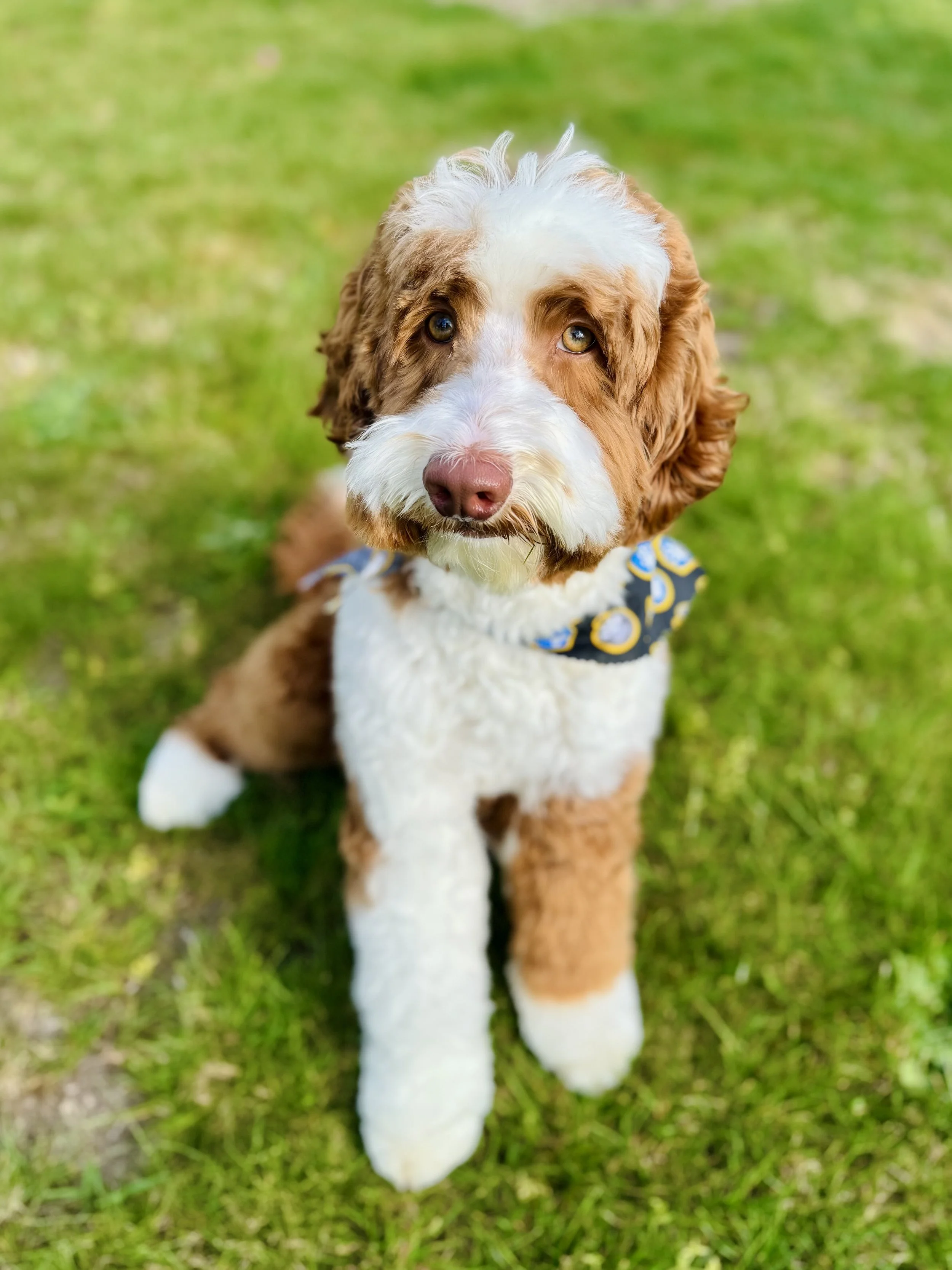 This is our sweet boy Enzo’s first litter. Weighing 28 lbs, Enzo is a fun-loving labradoodle who adores people and is always ready to bring great comfort to his four human children. Enzo enjoys being part of the family activities, and loves to be wherever his people are. He loves his walks, cuddle time, and being included with whatever is gong on. With a silky red wavy soft coat with white markings and a gentle temperament, Enzo is the perfect match with Tesla to produce puppies that will become the best companion dogs and family members..
